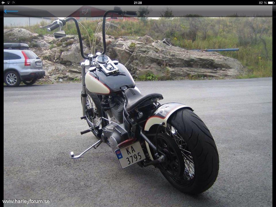 18" apes, Ride Wright black spoke Wheels. 180 bakdekk. custom bakskjerm, ingen fremskjerm. S&S Carb og luftfiltersats. V&H Short Shots, La Rosa skinnsete.