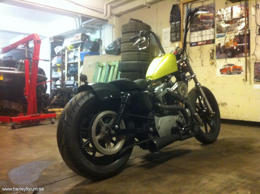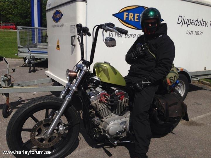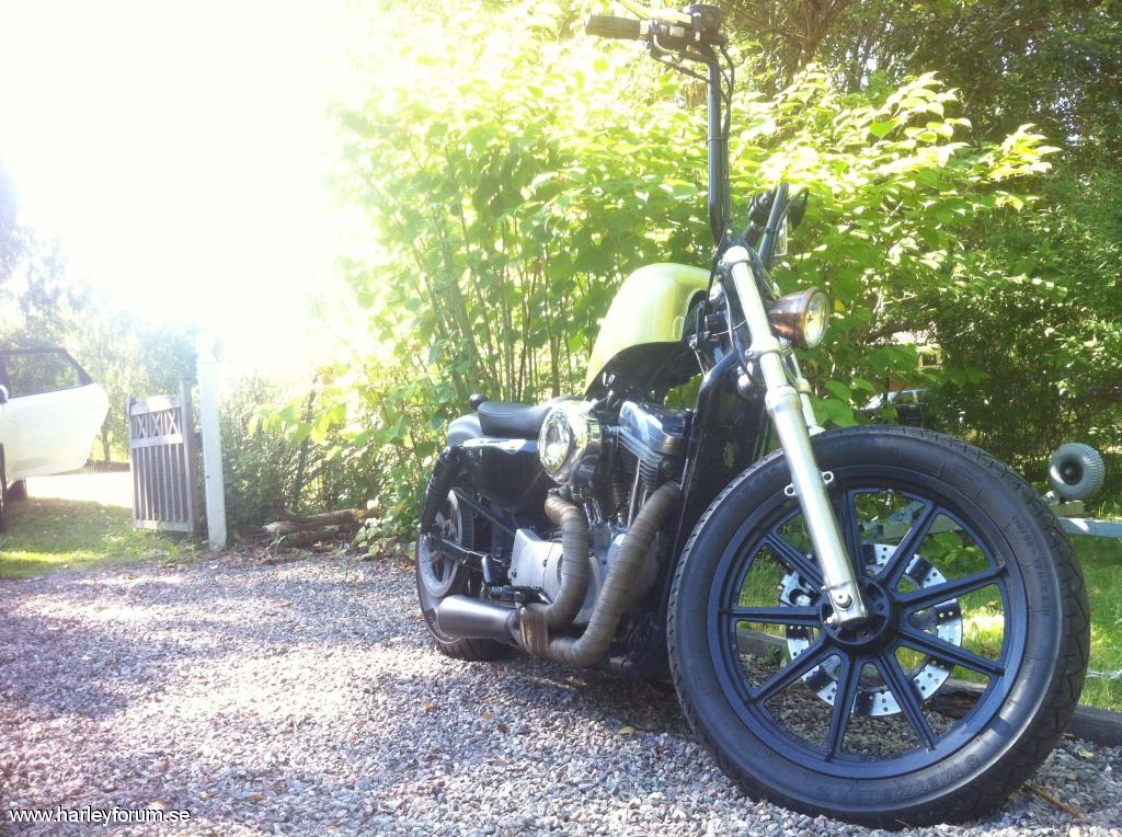 | Sportster XL Custom - 883 i gul/grön tappning Hjul: FXR/Sportster 90-tals 9 ekrade, pulverlackade svart Däck: Bak Avon 160/80/16, Fram Metzeler ME880 110/90/19 Styre: Burly narrow 14" apes, indragen el, retro handtag, 1" risers Framlampa: Fejkkoppar Bateskopia 4" Baklampa: Bateskopia Blinkers: Micro LED Hastighetsmätare: Flyttat till v-sida med universal fäste, indikatorlampor flyttade till avkapad och omvänd Sportster lampkeps. Tank: Sportster Peanut 7,8L - 90 tals med rak kant mot botten, höjd 3" Tanklock: Original till tanken Sadel: Harley 48 originalsadel Bakskärm: Kapad originalskärm + kapade skärmstag Framskärm: Ingen Bromsskivor: 5 star Zodiac Stötdämpare: Bak 10,5" Burly, Fram Sänkt 2" med PS fjädrar Avgas: DanMoto Higwayman 2-1, lindat med titanfärgad linda Fotpinnar: Original mittmonterat från Nightster 2010 Luftfilter: Cromad teardrop kopia med KN filter, omdragen vevhusvent till separat filter. Rensad på reflexer och remskydd, flyttat tändningslås, tändspole 2014 januari - SÅLD |