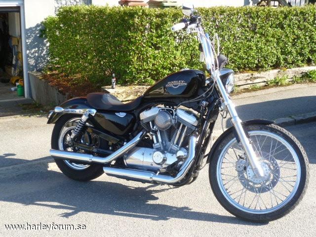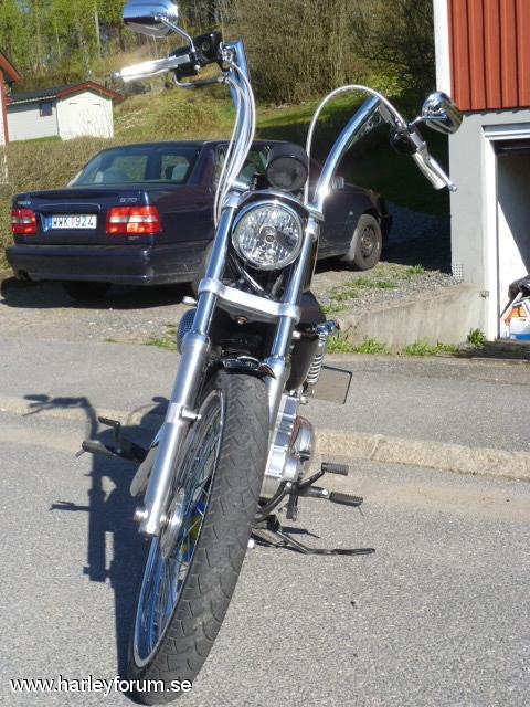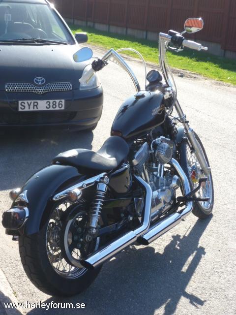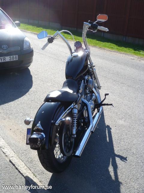 | 1200-konverterad av Tassen Racing. Portade toppar, nya cylindrar och ventiler, 10:1 kolvar. Kodlin bonanza bar 14" Screamin`eagle Super Tuner pro V&H 2-2 slip-ons Framflytt HD-orginal Breather Bendix/Keihin/S&S Super 21" framhjul |