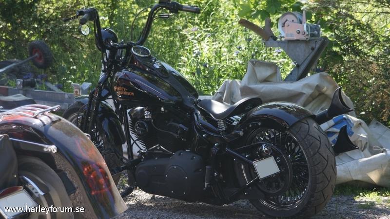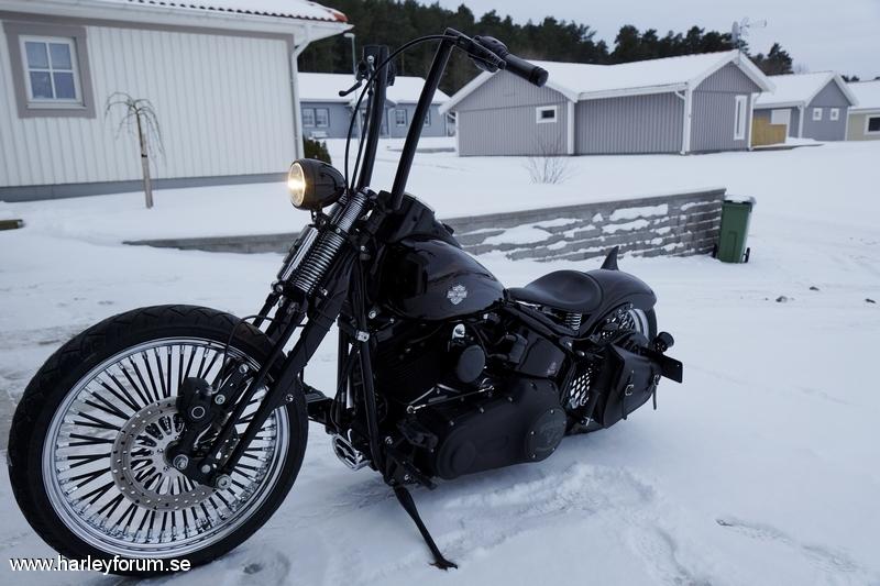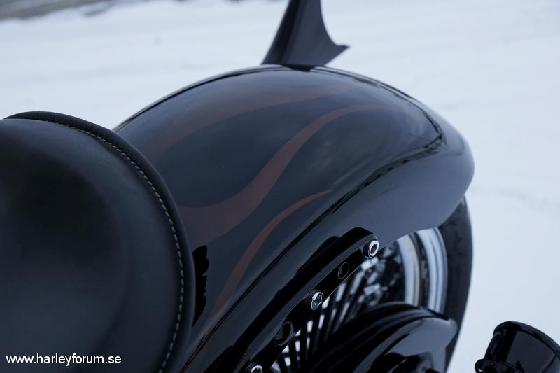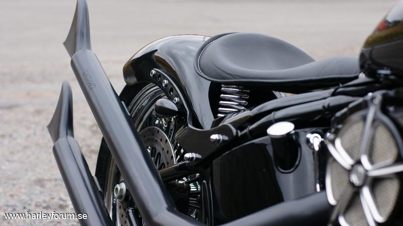 | Mammoth wheels 18" rear 21" front . Roland sand rear fender, legend air ride , burly springer lowering kit , roland sand engine covers , todds 17" apehanger ( stripper bar ) danny grey springer saddle , black forward foot controls . Samson fishtail upsweep .roland sand air cleaner , black transmission cover . Black primary cover , black hole levers , custom brake rotors polished , side mount licens plate holder , black round horn cover , Smooth 4 1/2 headlight , Heartland rear turn signals . |