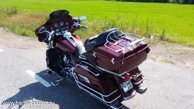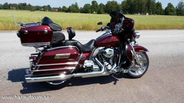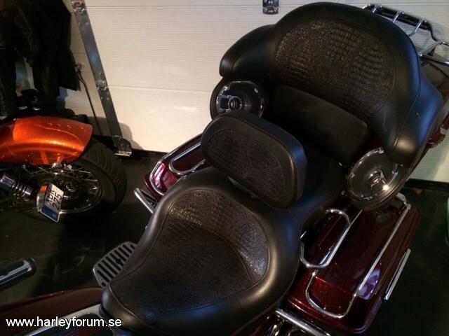 | Har uppgraderat min Electra till en skön långfärdscykel med mycket extra. Benny Cooper i Karlstad har hjälpt mig med bygget och Pobben i Hagfors har lackat ( 31 st delar ) riktigt snyggt. * Justerad motor för bättre prestanda. * Röd metallic med candy och grov silver flake och mycket "klarlack". * Bromsok lackade i samma färg som cykeln. * Sadel med krokodil inslag sydd av Sybo. * Sänkt fram & bak. * Monster pipor från Vance & Hines. * Kromade gaffelben. * Kromade Agitator fälgar och bromsskivor. * Bullets blinkers. * Air wings rails på topbox och packväskor med ledbelysning. * Led belysning längst ned på bakskärm och Topbox. * Batman vingar kromade med Led belysning på kåpan fram. * Cvo instrumentering, borstad krom. * Värmehandtag. * Nya högtalare med kromade kransar. * Ledljus kransar på alla tre lamporna fram. * Kromade backspeglar, fotplattor mm. * Special gjorda " H-D " rails till sidokåporna. * Och en del mer .... |